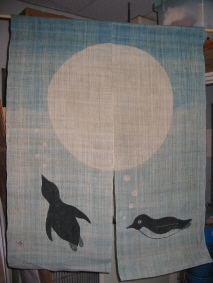 ろうけつで生地白にしたい部分をぬりつぶし、藍でぼかし染めしました。