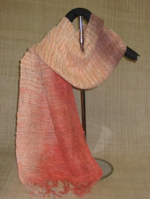 ピンクのムラ染めの糸を使い、変化をつけて織り上げ、スオウのアルミ媒染で両端を、