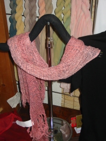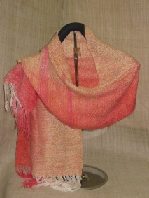 ピンクの糸を組み合わせて、織り分けられた後に、スオウのアルミ媒染で全体を染められました。